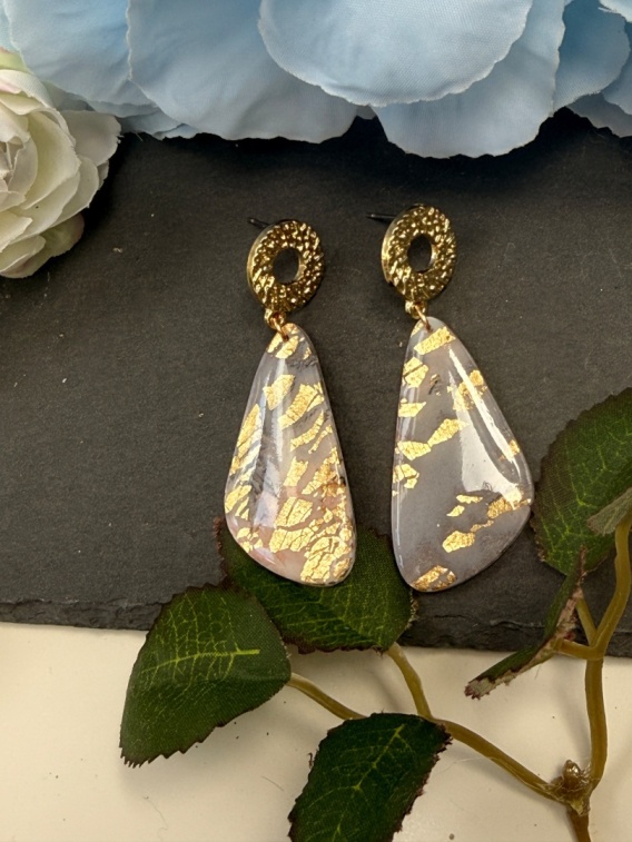 Gwarancja Twojej Wyjątkowości. To 100% autorskie rękodzieło. Każda kropla została ręcznie uformowana z gliny polimerowej, tworząc unikatowy, marmurkowy wzór w odcieniach szarości, bieli i subtelnego różu. Powierzchnia jest hojnie pokryta siatką złotych płatków, która imituje drogocenny metal. Kupując tę parę, masz pewność, że nikt inny na świecie nie będzie miał identycznej!