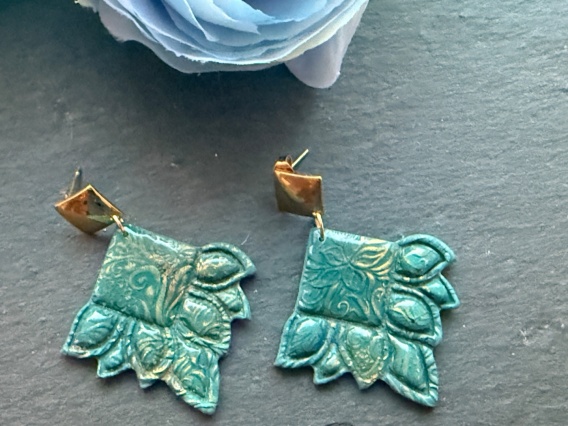 - Materiały: Glina polimerowa (fakturowany liść), metalowe elementy w kolorze złotym [Sugerujemy dodać: antyalergiczne sztyfty ze stali chirurgicznej].