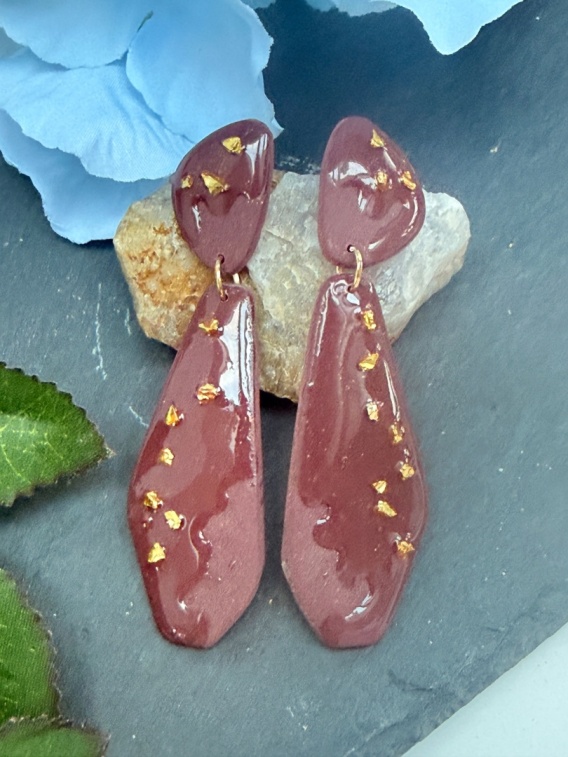 - Kaskada: Kolczyki składają się z dwóch elementów – mniejszej, górnej kropli o organicznym kształcie i wydłużonego, geometrycznego wisiora. Każdy element zosta ręcznie uformowany z gliny polimerowej w głębokim odcieniu burgundu/czerwonego wina. Powierzchnia jest lśniąca i wysadzona złotymi kryształkami .