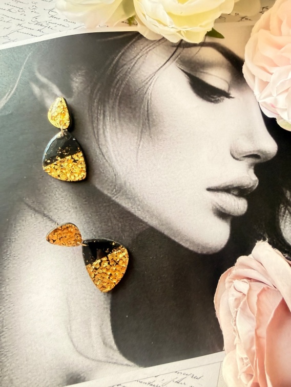 Zdefiniuj swój styl na nowo z odrobiną geometrycznego blasku. Kolczyki "Geometric Gold Flow" to propozycja dla kobiet, które kochają minimalizm z luksusowym wycięciem. Połączenie surowej, czarnej bazy z gęstym, niemal jednolitym pasem złotych płatków w dolnej części tworzy efektowny kontrast, który pięknie rozświetla twarz.