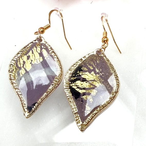 - Materiały: glina polimerowa, złote płatki, metalowa baza w kolorze złotym, bigle ze stali szlachetnej (antyalergiczne).