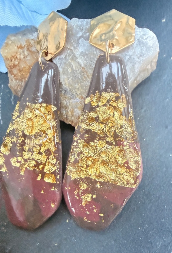 Efekt Szlachetnego Kamienia: Połączenie głębokiego burgundu z intensywnym, płatkowanym złotem sprawia, że kolczyki wyglądają drogo i luksusowo.