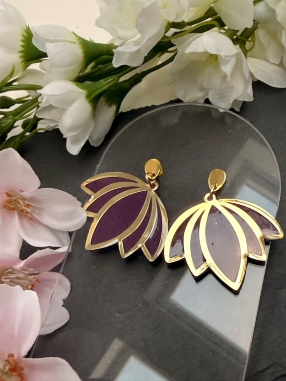 Szukasz dodatku, który wyróżni Cię z tłumu? Te ręcznie robione kolczyki to małe dzieła sztuki stworzone z pasją i dbałością o każdy detal. Inspirowane naturą, przypominają delikatne płatki kwiatu – elegancko rozłożone, w głębokim, śliwkowym kolorze, otoczone złotym konturem, który dodaje im klasy i blasku.