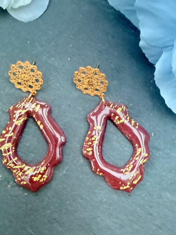 - 100% Rękodzieło: Każda ażurowa kropla została ręcznie uformowana z gliny polimerowej, uzyskując szklistą i głęboką barwę burgundu. Nieregularny kształt dodaje im unikalnego, artystycznego charakteru.